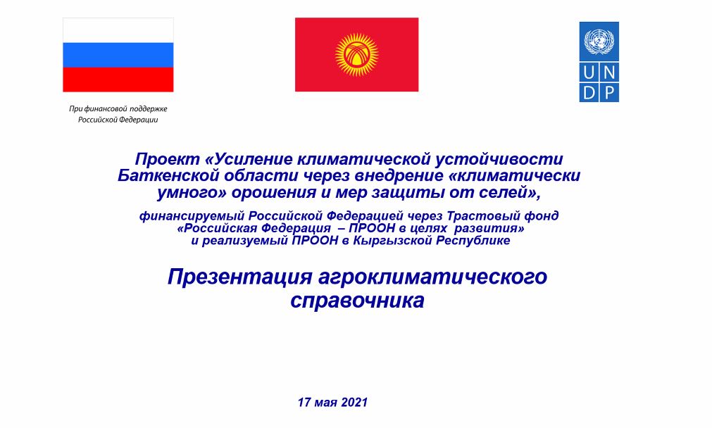 17 мая 2021 года Кыргызгидромет и российские эксперты Федеральной службы представили результаты своей работы и презентовали Агроклиматический справочник, составленный на основе рекомендаций экспертов Федеральной службы России.