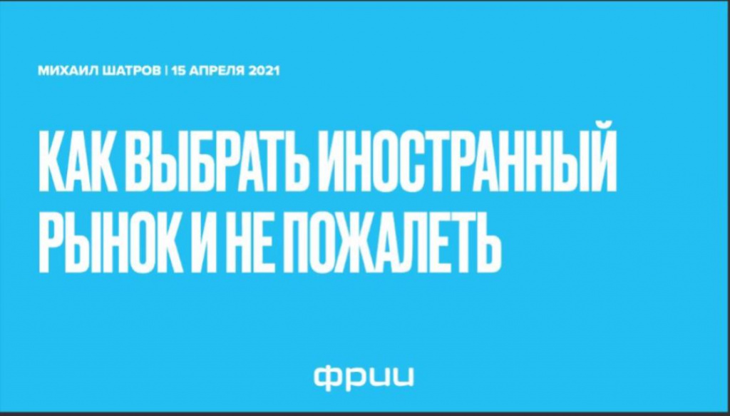 15 апреля 2020 года состоялся вебинар «Гайд для стартапов. Как выбрать иностранный рынок и не пожалеть», на котором затрагивались вопросы особенностей зарубежных рынков стартапов, их структуры, способов выхода на зарубежные рынки. Руководитель скаутинга ФРИИ также рассказал о возможных трудностях, с которыми могут столкнуться начинающие стартаперы при привлечении инвестирования на зарубежных рынках.