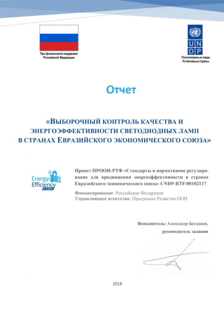 В период с 30 июля по 25 ноября 2018 года международный эксперт из Российской Федерации Александр Богданов провел оценку рынка светодиодных ламп в странах ЕАЭС, разработал методологию закупок и испытания образцов ламп с учетом специфики стран региона, а также выработал квалификационные критерии для отбора испытательных лабораторий в странах ЕАЭС.